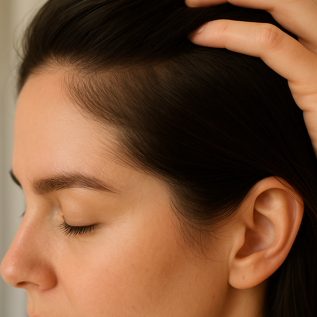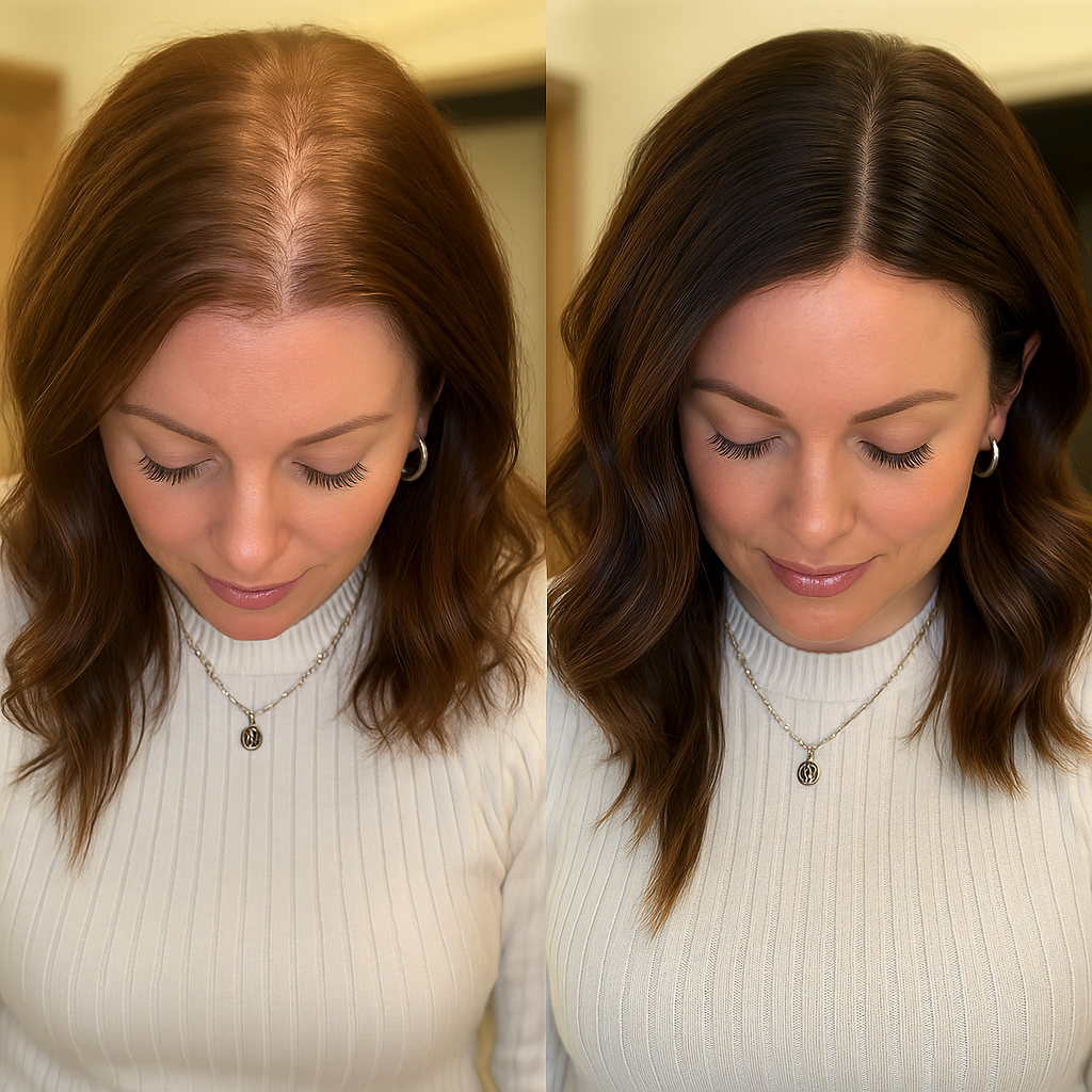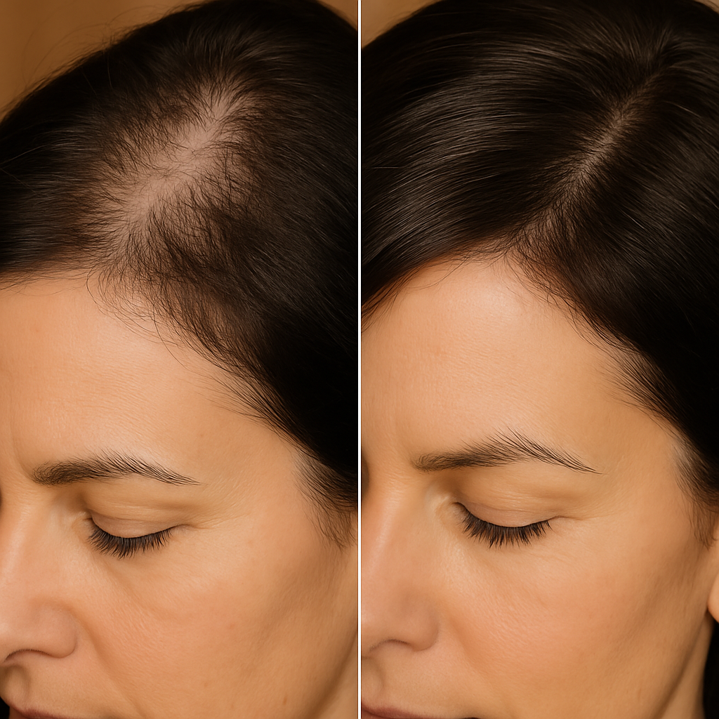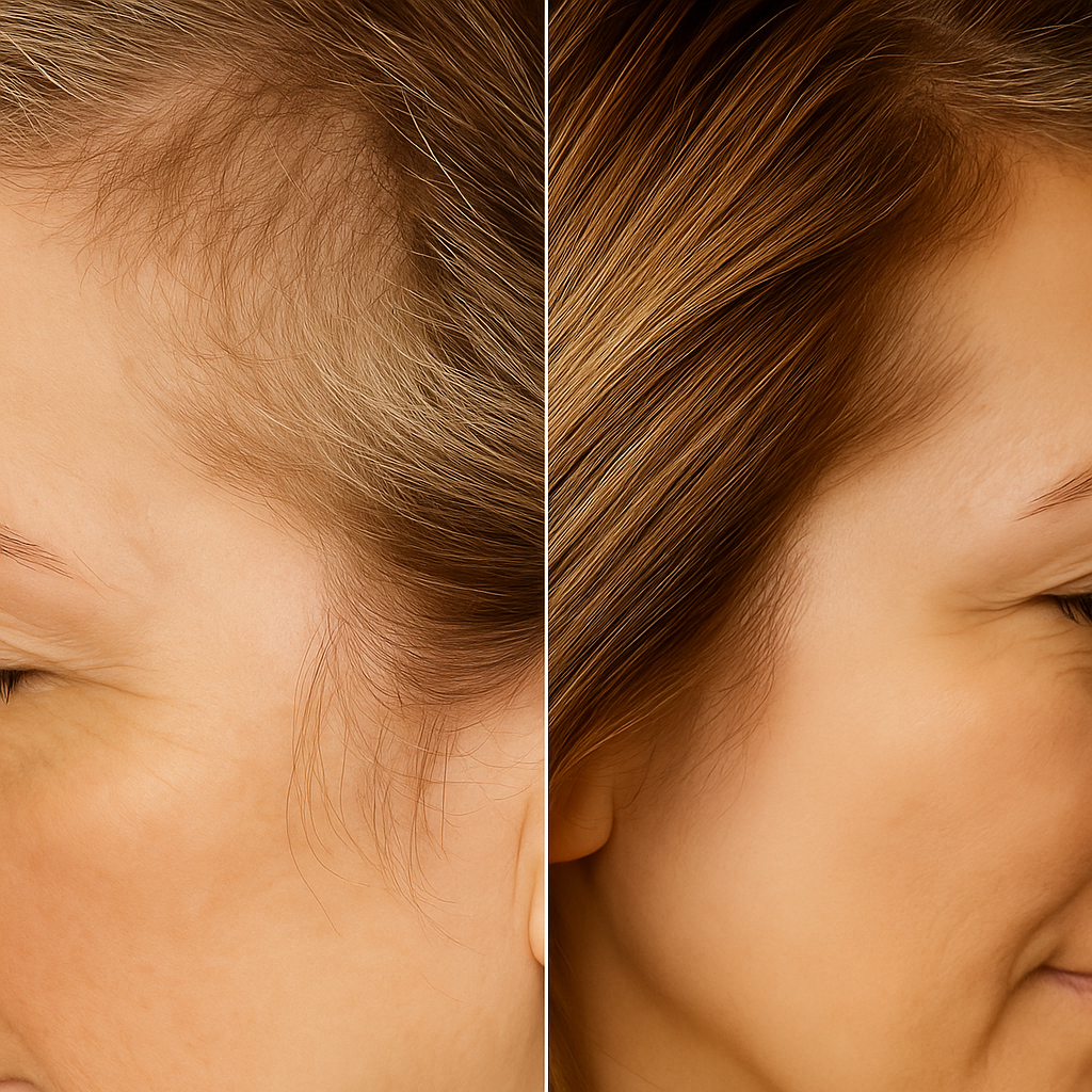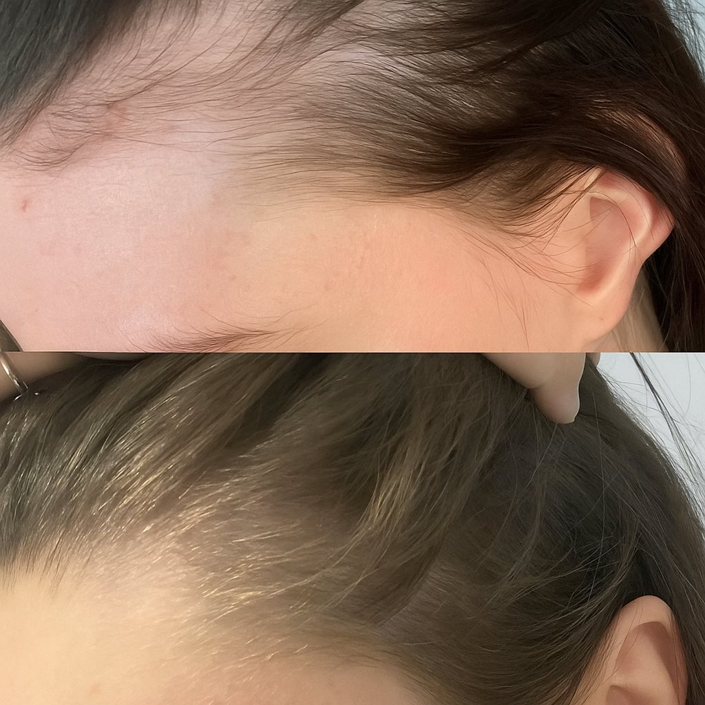 Le soir, sur cheveux secs ou légèrement humides, applique 3 à 6 gouttes directement sur les zones clairsemées (tempes, sommet, raie…).